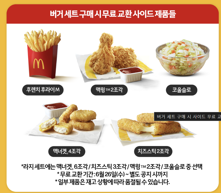- 버거세트 구매시 사이드 무료 교환