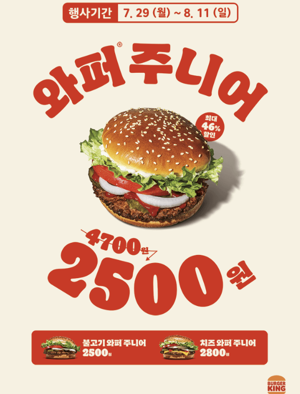 ▶ 가격 : 와퍼주니어, 불고기와퍼주니어, 치즈와퍼주니어(2,800원)